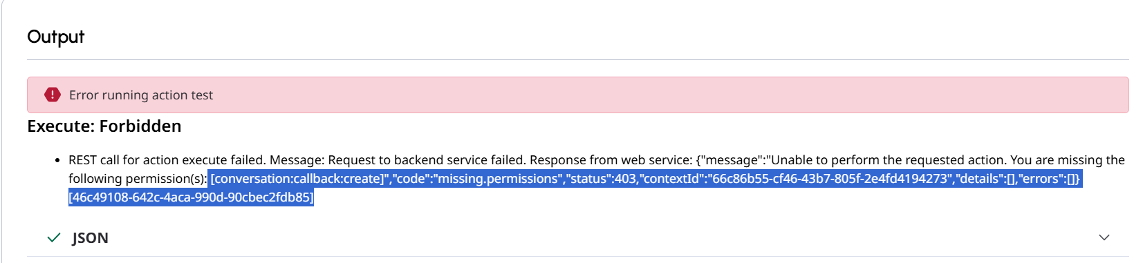 So I would first double-check the OAuth client / integration credentials being used by the Data Action, since Genesys data actions run using an OAuth client with Client Credentials, and that credential needs the required callback permission/scope.