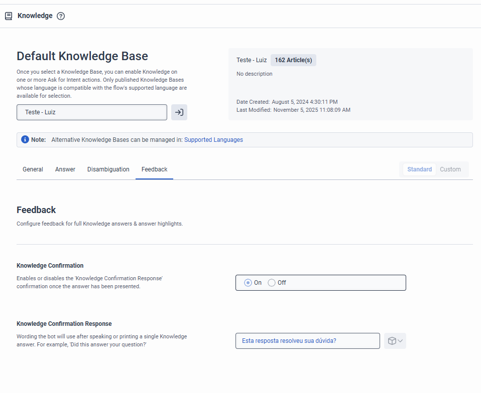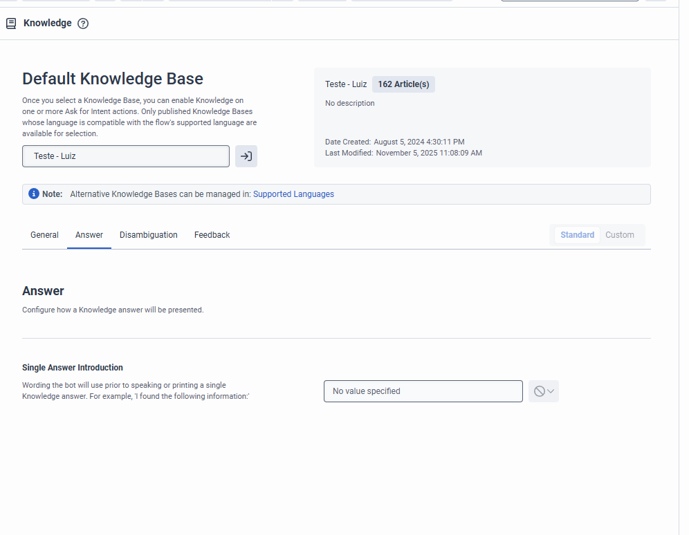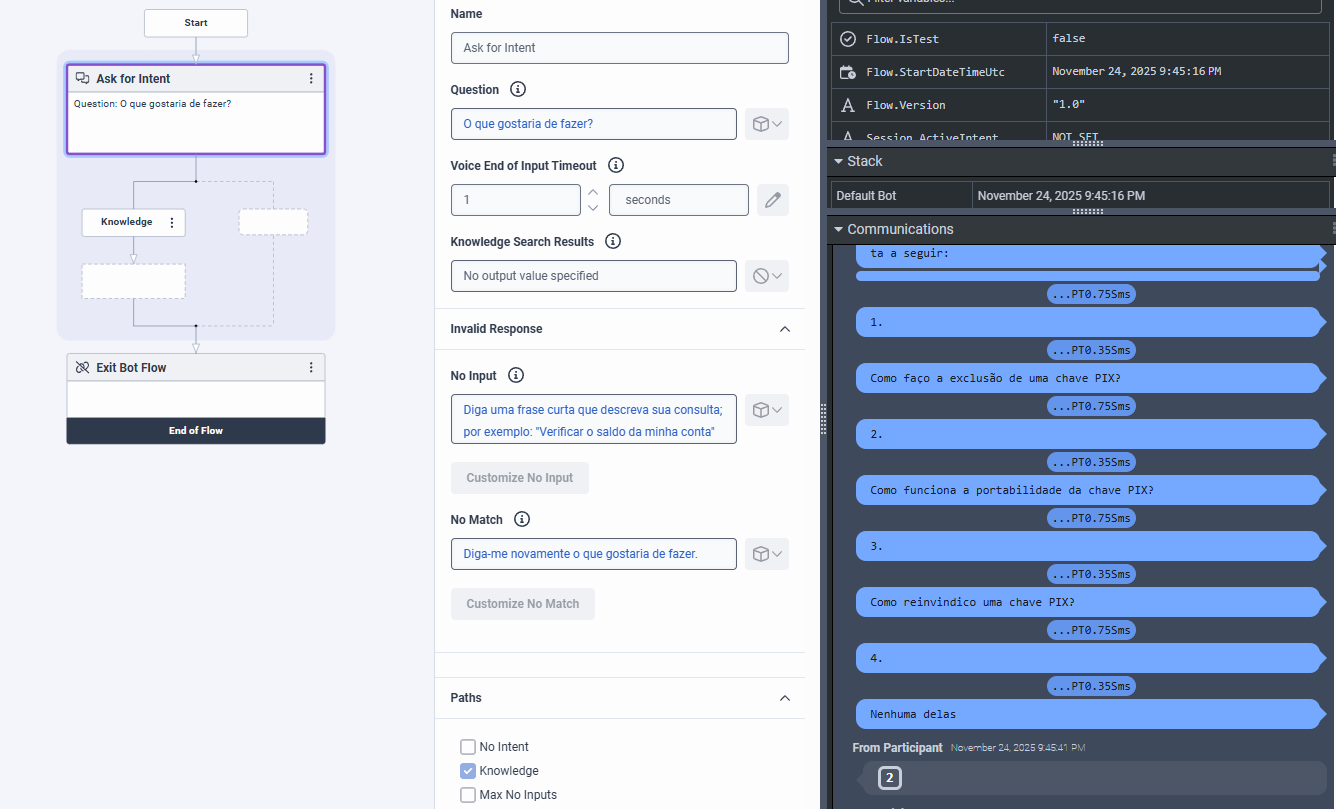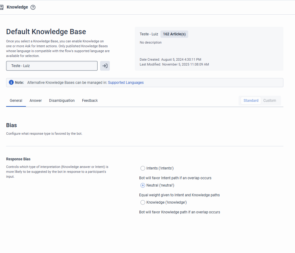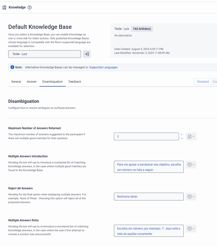 I used the default configurations. The org I tested is Genesys Cloud CX 3. I used an Ask for Intent action and, inside it, I selected the Knowledge path. To reach the disambiguation step, I said a generic phrase so the NLU wouldn't return a 100% match, and then it followed the standard settings.