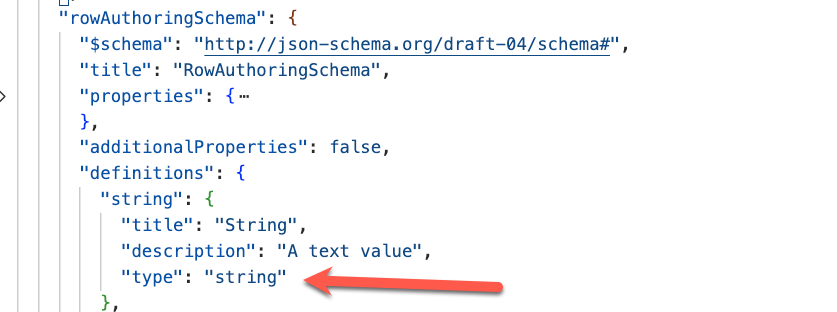 This happens when trying to deserialize the "string" definition in the "rowAuthoringSchema" -> "definitions" object: