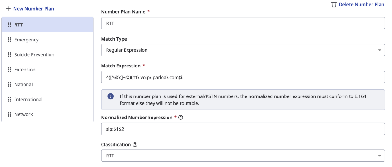 - There is a site number plan set :^([^@\:]+@)(rtt\.voip\.parloa\.com)$