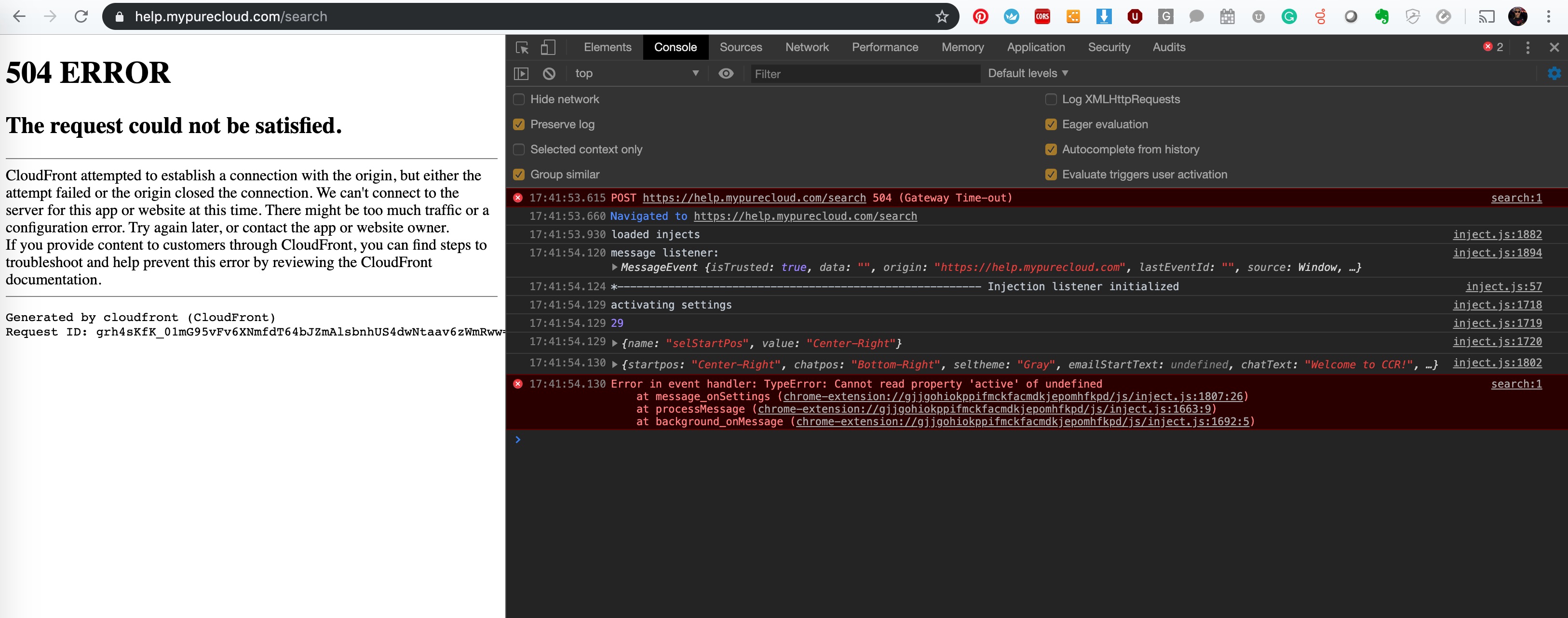 Hey @OKTAY KEMAL, I'm not getting an error when I do a search. Out of curiosity, have you tried doing the search on know.genesys.com? It offer federated search, so you'll get results across multiple channels.  ​Sometimes clearing cookies and cache helps with problems like this.