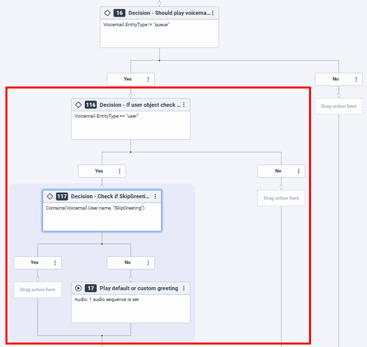 I'm wondering for this though if it would be better for you to use Group Voicemail? You can upload greetings directly to it and you can even have the email notifications send out a transcription of the message.