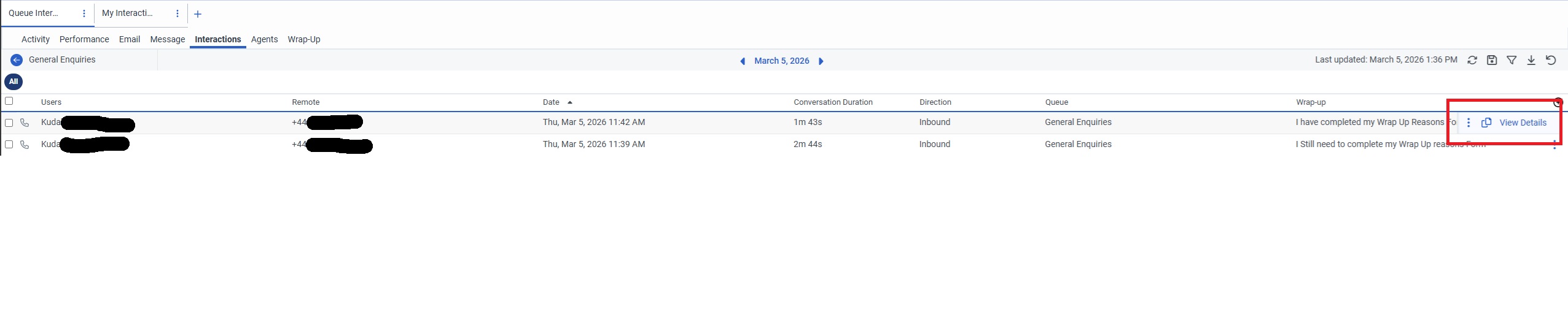 So what used to happen was you could click anywhere on an individual interaction to view its details and the recordings etc, but since about the 2nd of March, we have to use the meatball menu on the far right. In the screenshot above, from the My Interactions tab, there isn't an option to View Details for the interaction. Everyone, admins, agents, supervisors, can only copy the Conversation ID or toggle the voice quality flag.