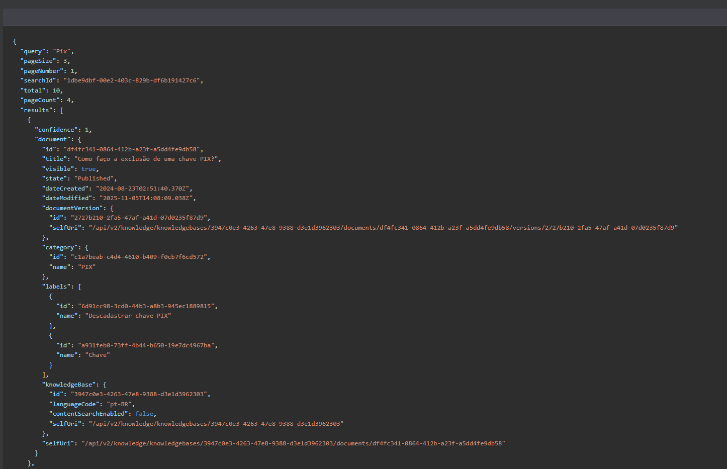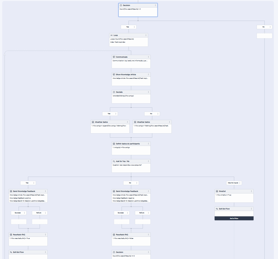 Natively, the bot already performs this search, but if you want to add more business rules, as I did, I configured it to return up to the top three articles and ask the user whether the article was positive or negative to collect feedback.