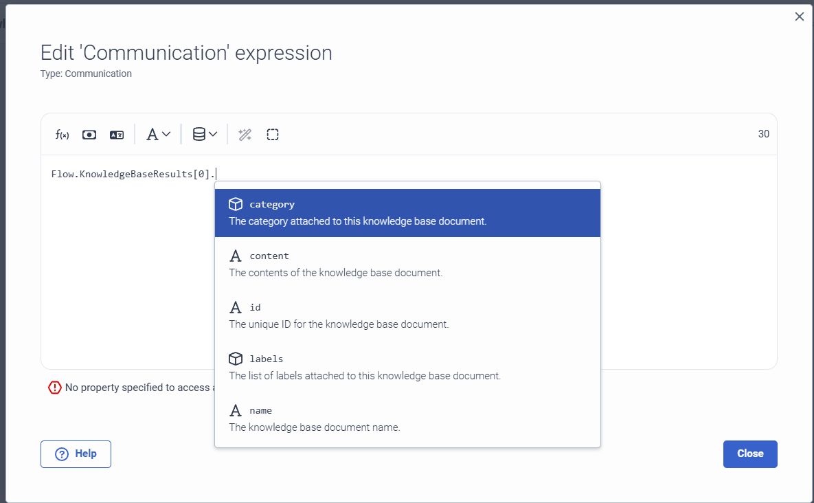 I know that I can access the collection "Knowledge Search Results", but the collection object does not contain any confident scores as stated by @Rory Brennan in another community post https://community.genesys.com/discussion/knowledge-confidence-score => the variable "Flow.searchResults[0].confidence" is not available.