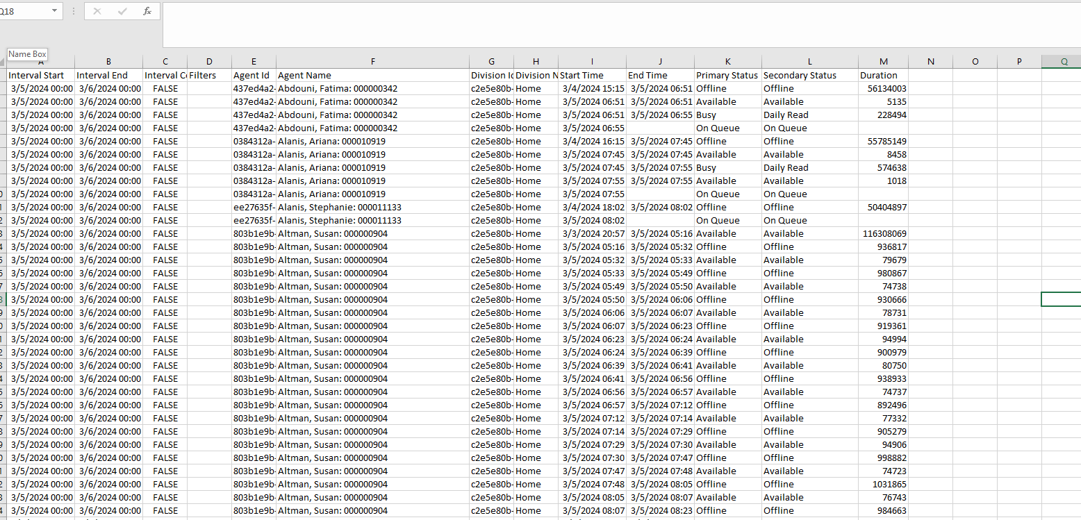 I appreciate both of your replies. Unfortunately, both of these views only allows me to see the detail one agent at a time whereas in schedules I can see detail as a group. Viewing group detail allows me to export the data and throw it into a pivot table where I can easily compare length of time in any given state between multiple agents. Activities would be much more beneficial from an actual point of view vs. what was originally scheduled.
