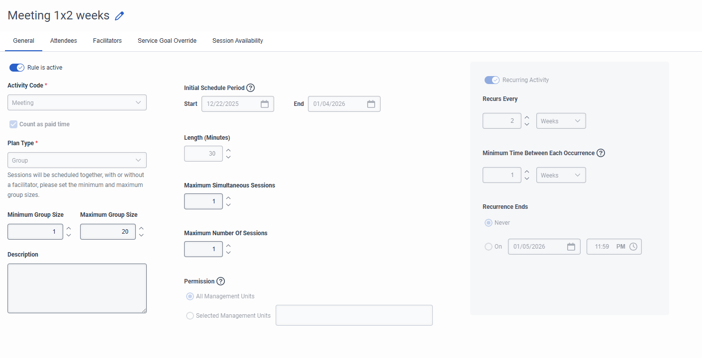 - Now that the 1st session has been scheduled and the schedule published, delete the Session Availability. The recurrence rule will now enforce the cadence of the session.