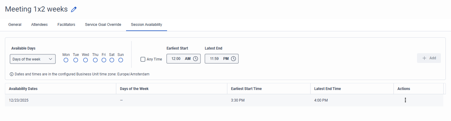 - Add a new Session Availability using the Days of Week option and selecting the day you would like the meeting to be scheduled on