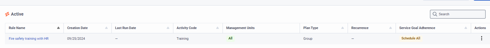 If you want to update your existing published schedules, you need to click 'Run Now', which you can access by clicking the rule name "Fire Safety Training with HR" and then find the button at the top right of the screen.  You should see a little spinner next to your rule name while it is running.