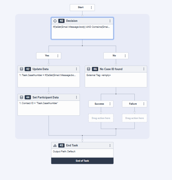 In the inbound email flow i've added a task as below containing this expression: If(IsSet(Email.Message.body) AND Contains(Email.Message.body, "Case Number: "), Substring(Email.Message.body, FindString(Email.Message.body, "Case Number: ") + Length("Case Number: "), 8), "no id")