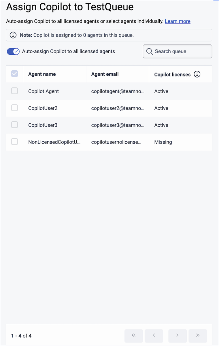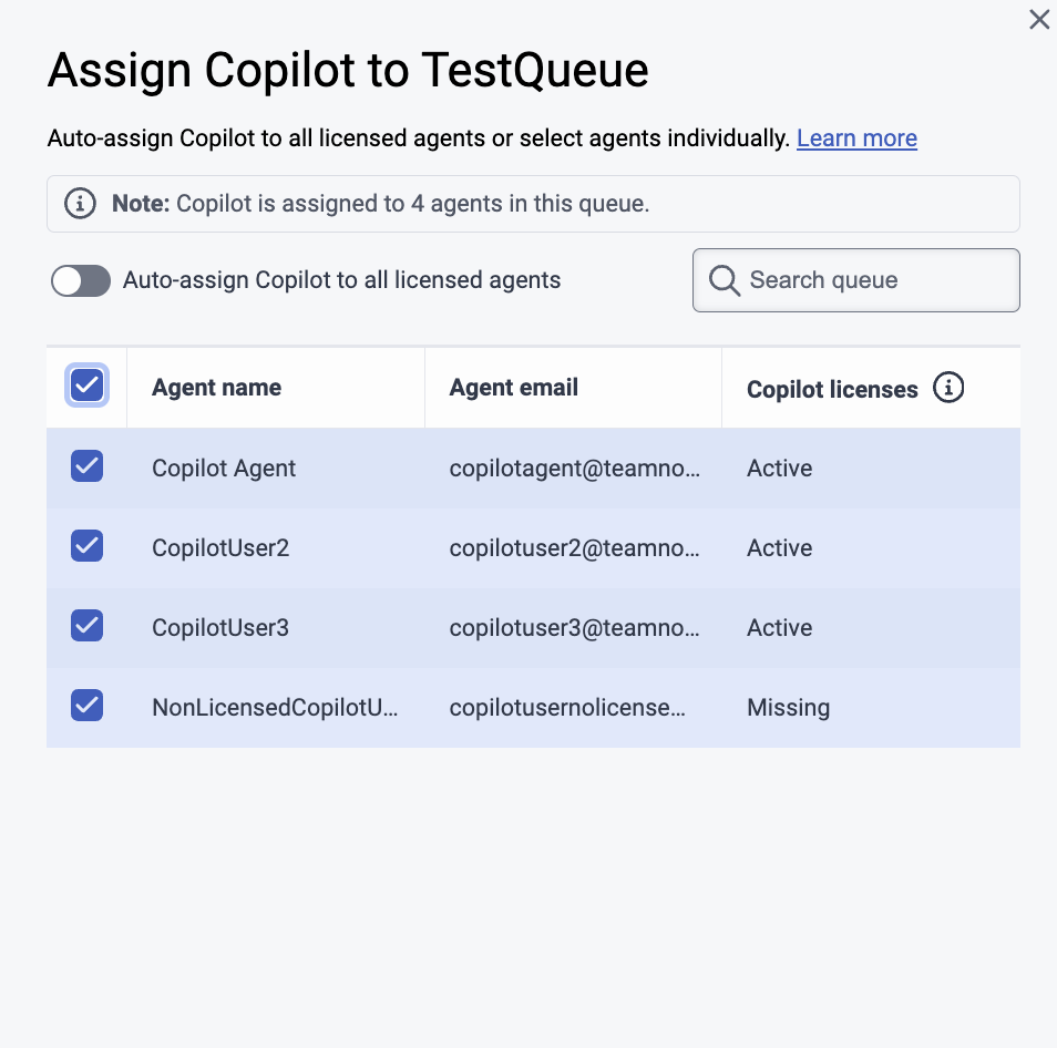 Automatic Assignment for New and Existing Members: When auto-assignment is enabled on a queue, it will automatically assign Agent Copilot to both new agents joining and existing queue members, as long as they are licensed.