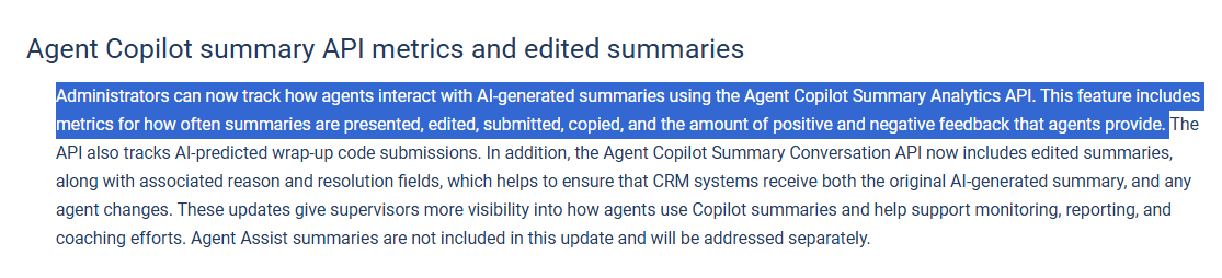 In this week's release notes, there's a mention of the Agent Copilot Summary Analytics API, but I'm not sure which API it refers to.
