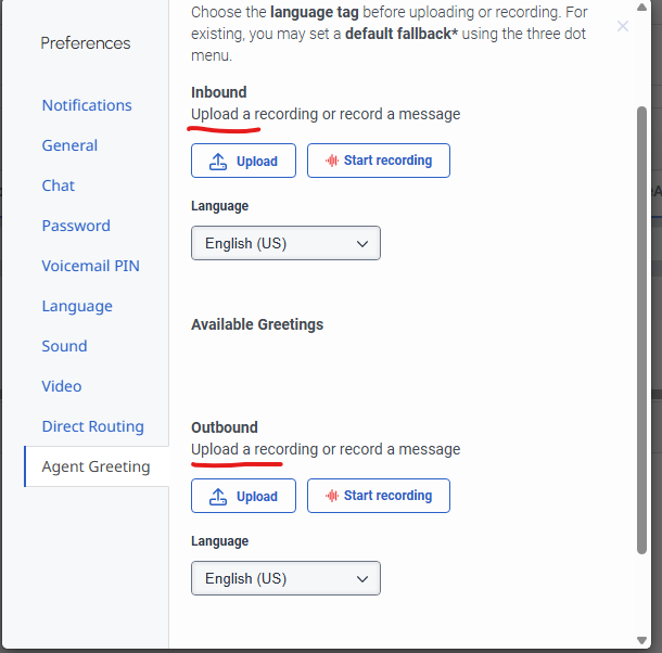 You can however only upload or recording an "inbound" recording under the agent greeting which will only play on inbound calls for the specific queue. I tested it on my side where I had the audio loaded for outbound but not for inbound. When making an outbound call I could hear the agent greeting, on inbound I did not hear the recording.