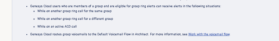 • Genesys Cloud users who are members of a group and are eligible for group ring alerts can receive alerts in the following situations: