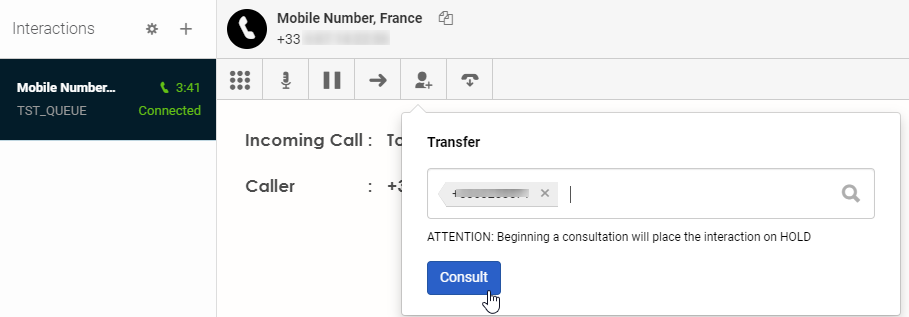 Transfer/Consult button disabled.