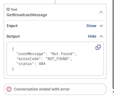 But it fails in Agentic. I've tried multiple variations in the output instructions, but in every case, the conversation ends with an error.