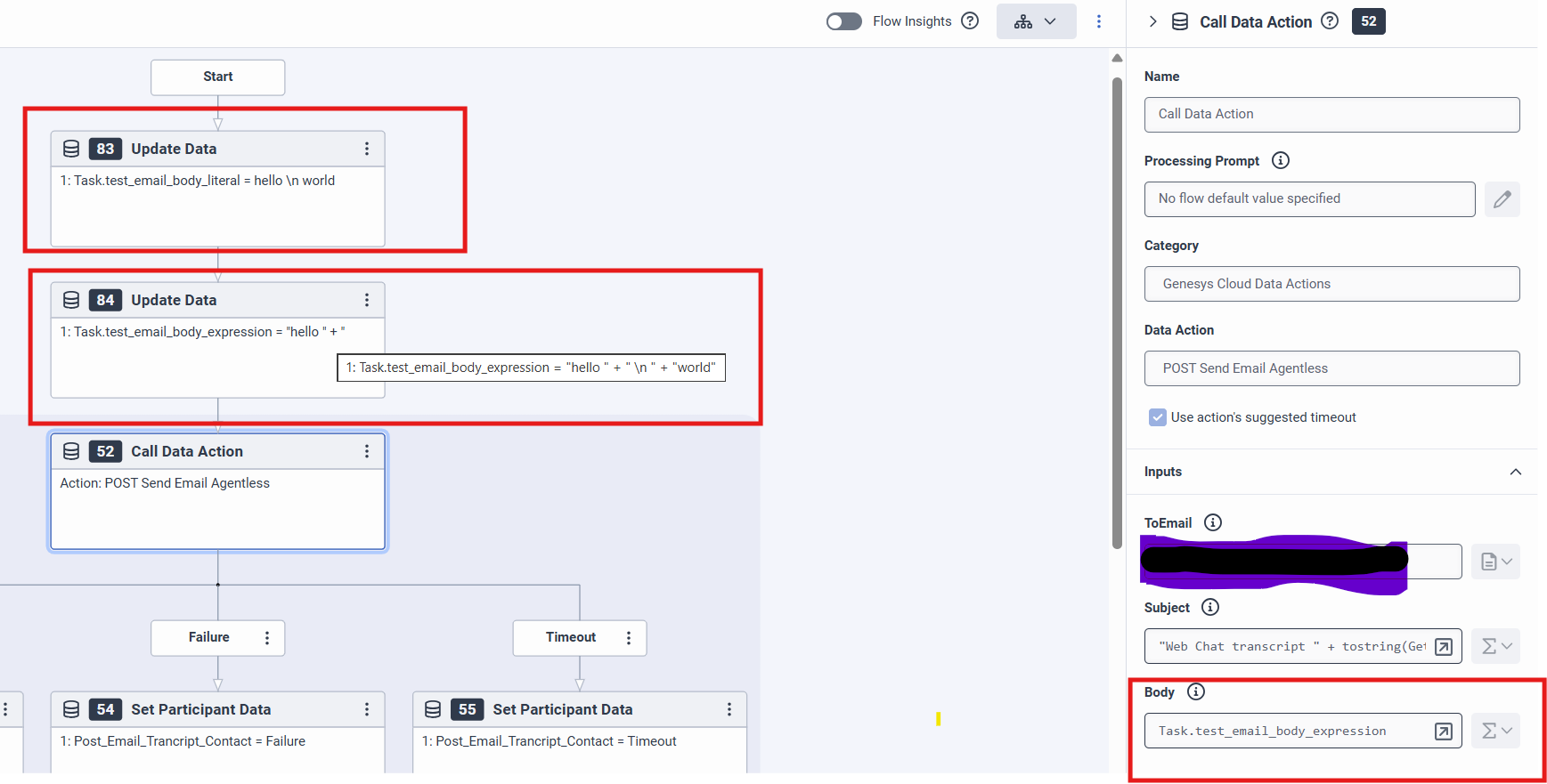 The data action fails when I use a variable expression for my email body. The data action is successful when I use a variable literal for my email body.
