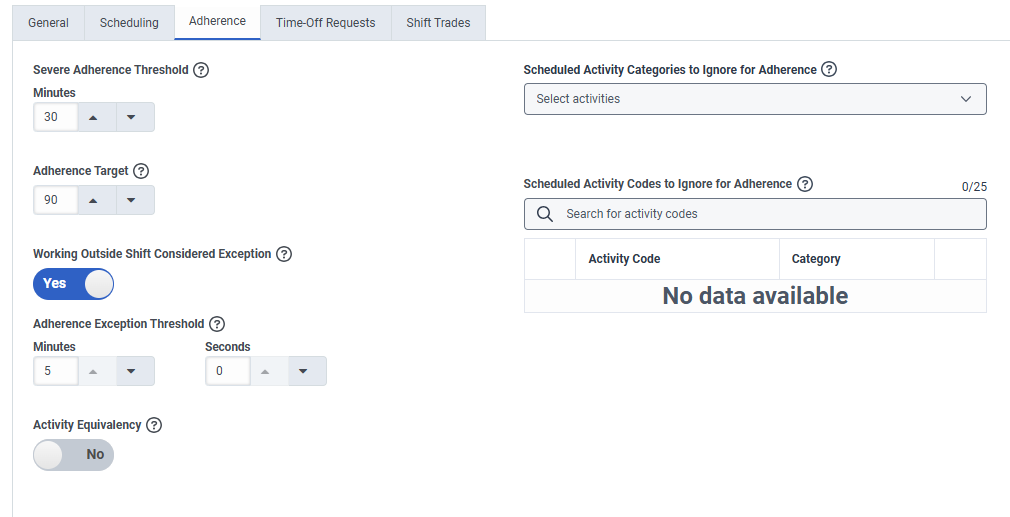 - The system considers agent in adherence when they have no scheduled activities and a status set to an activity code mapped to Unavailable or Time Off.