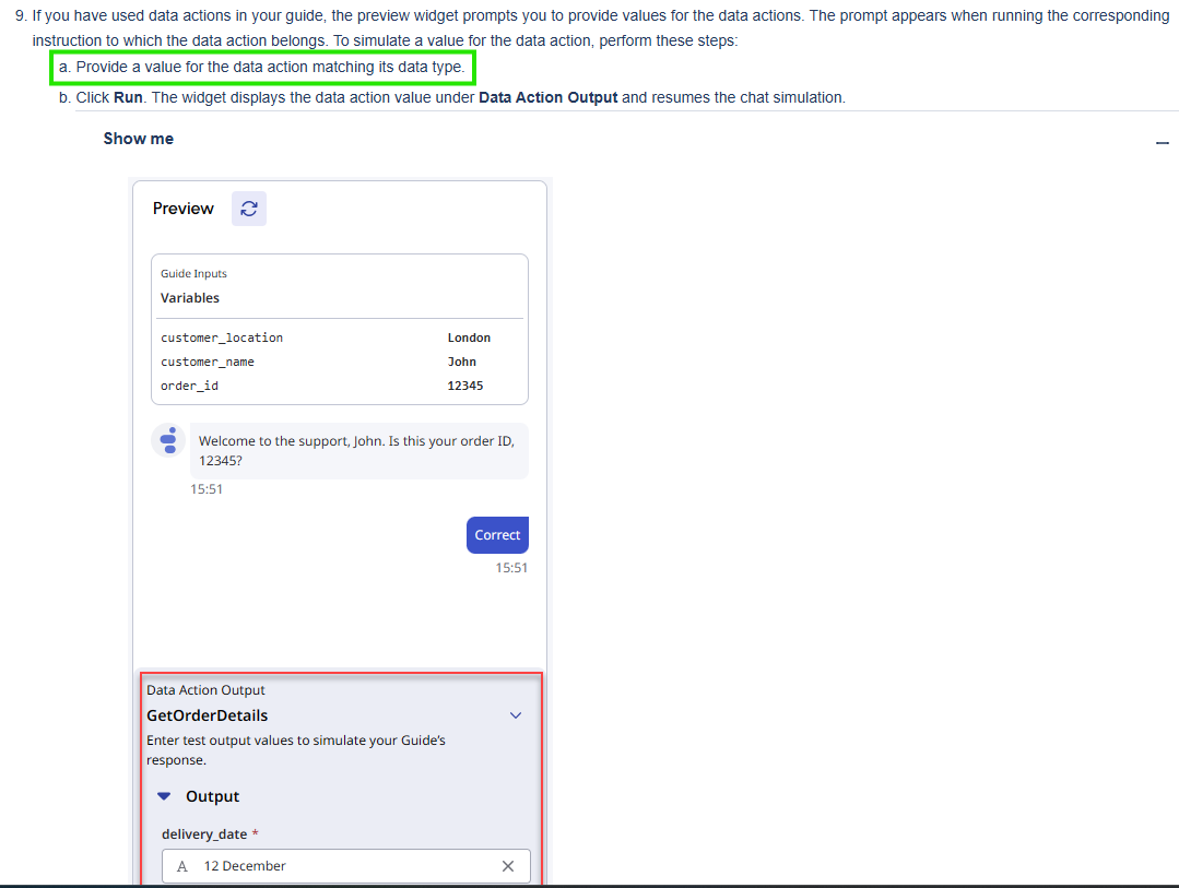 - Idea SAAIS-I-24 | Data action output variables that are used in the prompt need to be underlined or highlighted so they stand out.