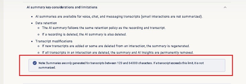 Summaries are generated only for transcripts between 120 and 64,000 characters. If a transcript exceeds this limit, it will not be summarized.