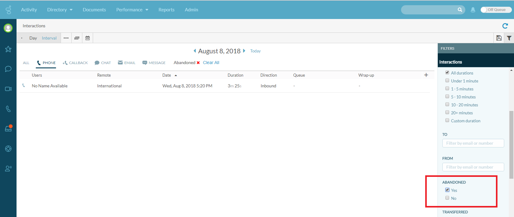 {{ "interval": "2018-08-08T04:00:00.000Z/2018-08-09T04:00:00.000Z", "order": "desc", "orderBy": "conversationStart", "paging": { "pageSize": 1, "pageNumber": 51 }, "segmentFilters": [{ "type": "and", "predicates": [{ "dimension": "mediaType", "value": "voice" }] }, { "type": "or", "predicates": [{ "dimension": "direction", "value": "inbound" }, { "dimension": "direction", "value": "outbound" }] }], "conversationFilters": [{ "type": "and", "predicates": [{ "type": "metric", "metric": "tAbandon", "operator": "exists" }] }], "evaluationFilters": []}