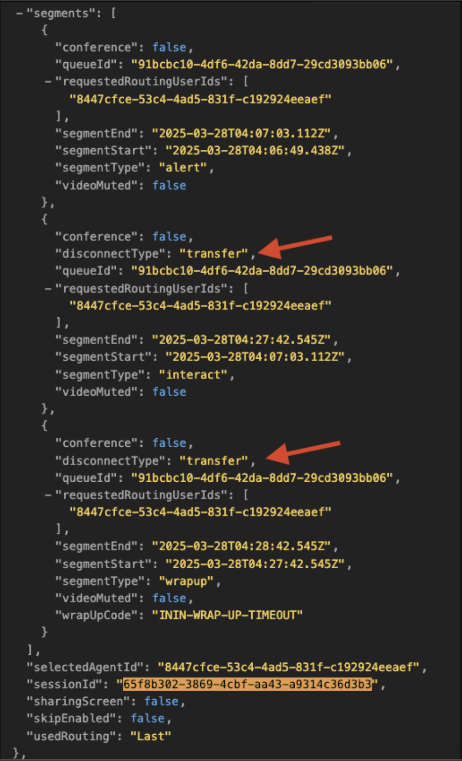 Hi @Jacob Shaw, for both agents in the segments object, I can see that the disconnectType is listed only as "client".