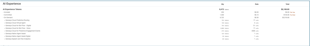 - We are billing based on events the system generates when an interaction is summarized or insights generated based on your Program settings. How much is outlined here: https://help.mypurecloud.com/articles/genesys-cloud-tokens-based-pricing-model/ (refer to AI Summary & Insights)