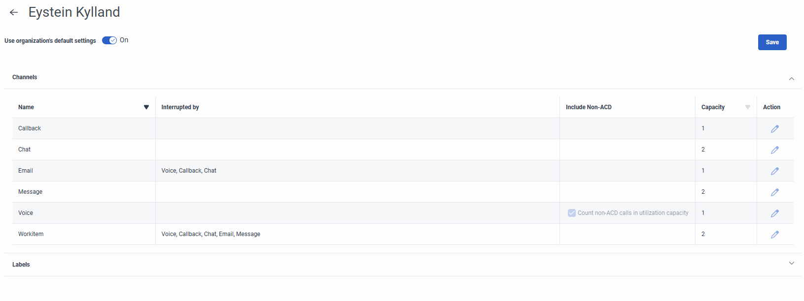 - Interacting: The agent is On Queue handling an interaction with a customer or completing after-call work for an interaction. Genesys Cloud can still route them another interaction, depending on how administrators have configured agent utilization.