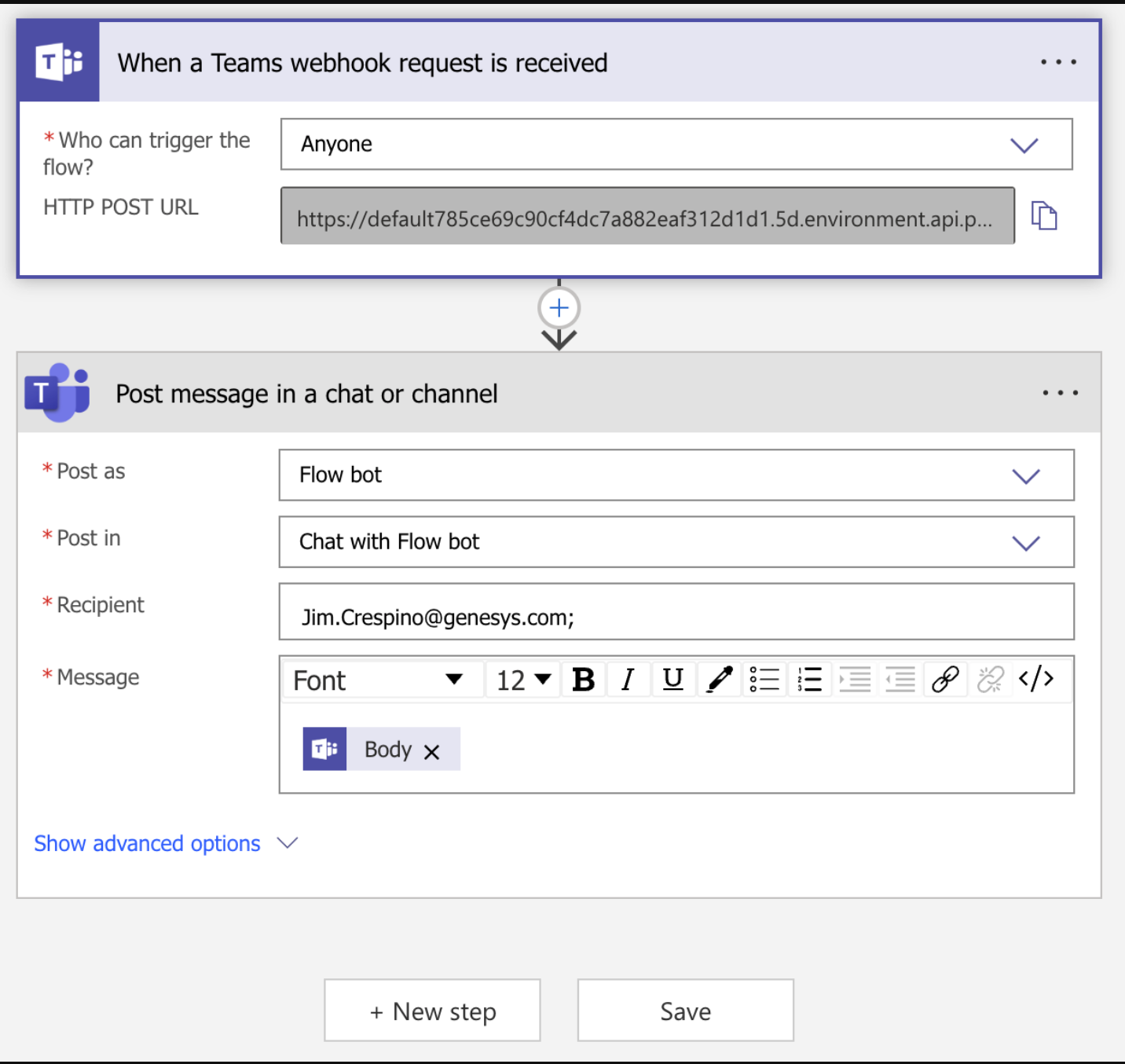 Or am I misinterpreting "Teams Workflow Webhook"? I have talked to a MS Teams expert at my company, and the Workflow (via Power Automate) is fairly straight forward and quickly formed and tested internally on network, with your example as great guidance, so the endpoint (with future derived parms TBD) is available, but connecting from Genesys into Azure Graph needs an integration? If we can get that, we can build a Data Action (just for POC), but I cannot seem to connect the dots for getting that door into Azure Graph API or really the MS Power Automate Workflow Endpoint that we have created (only for POC).