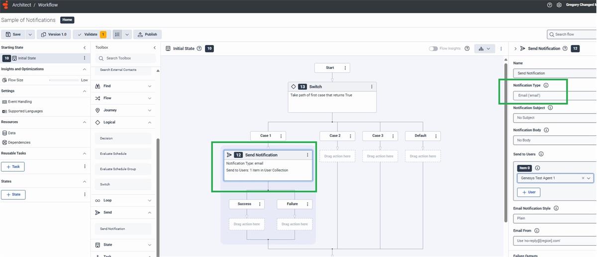 For comparison, an Architect workflow can send an email or SMS via built-in elements (and works of course), but we are looking for the 'toast' alert.