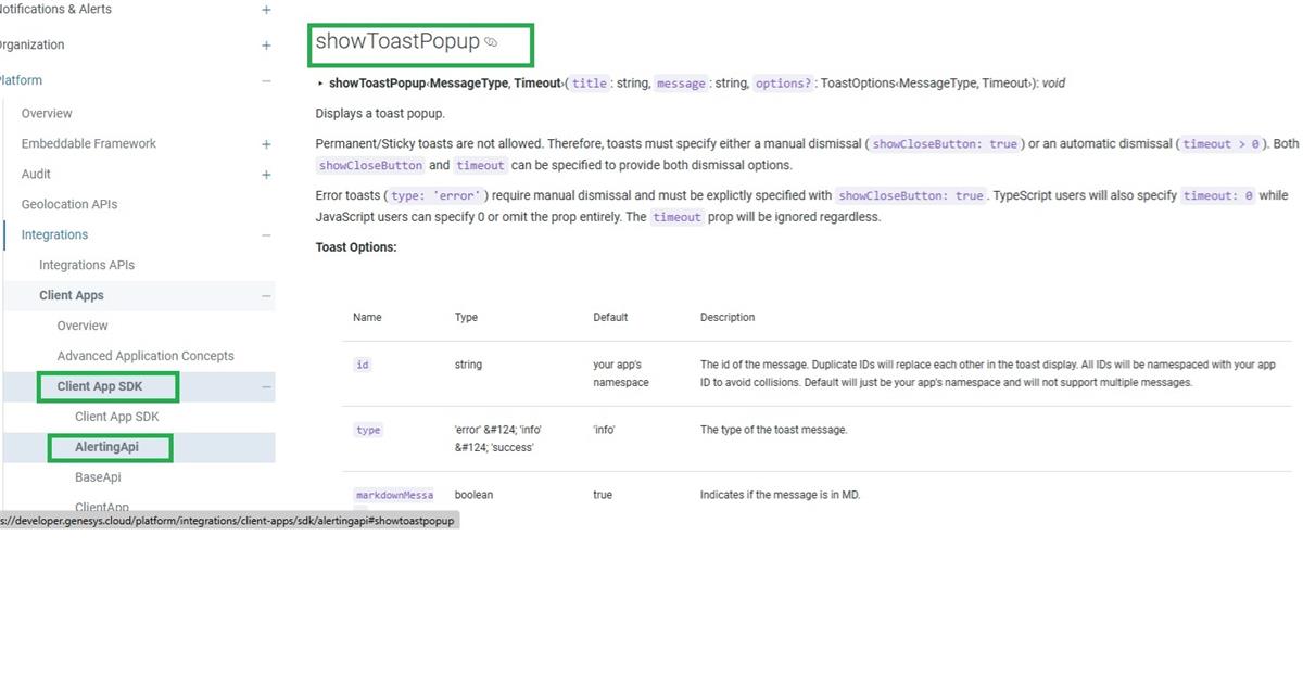 I am wondering if there is a Genesys API to create a 'toaster' via a Data Action call from an Architect Workflow to create an 'in-app' alert/toast like what appears in the general Alert Rules setup? We don't want to send an email or SMS, that would be too asynchronous. The idea is that if you can set up one in Alert Rules for that offered domain, can you create on via API that just has a message?