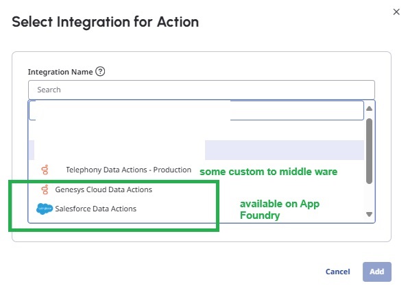 However, before I can do this, I need to select an Integration, much like one for Salesforce or the Genesys Platform or (sort of hidden) a custom integration built from the available 'Web Services Data Actions' in App Foundry? Is this last one how you connect to Microsoft?