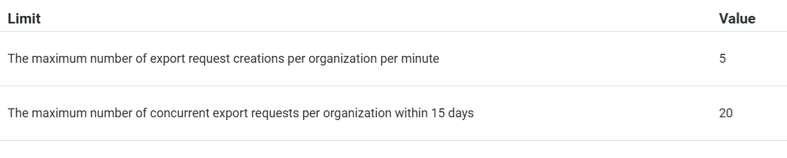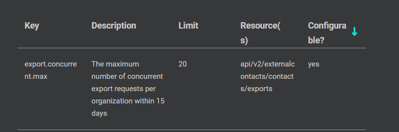 Hi, I've found the limit, it's 20 exports over 15 days as shown here https://developer.genesys.cloud/commdigital/externalcontacts/export. Can the limit be increased?