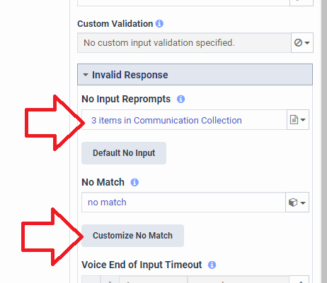 In the ask for actions, you have new customize no input & customize no match buttons.  If you click them, you can add a list of communications to use instead of a single communication.  For this example I added 3 items for no input.  The 1st time the caller doesn't say anything they will hear my 1st item.  The 2nd time they hear the 2nd item, and the 3rd time they hear the 3rd item.  I didn't customize the no match, so the caller will hear the same communication every time they say something that doesn't match.