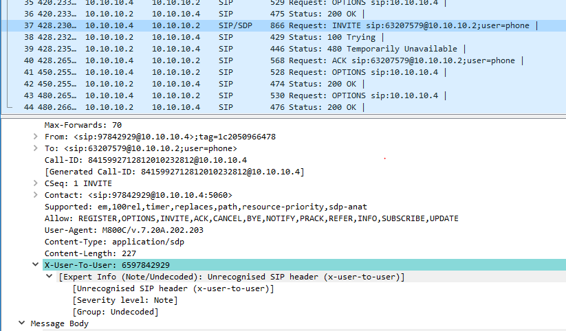 In the SIP message, I can see the "X-UserToUser" header is configured with a value, the below SIP log is extracted from Edge.