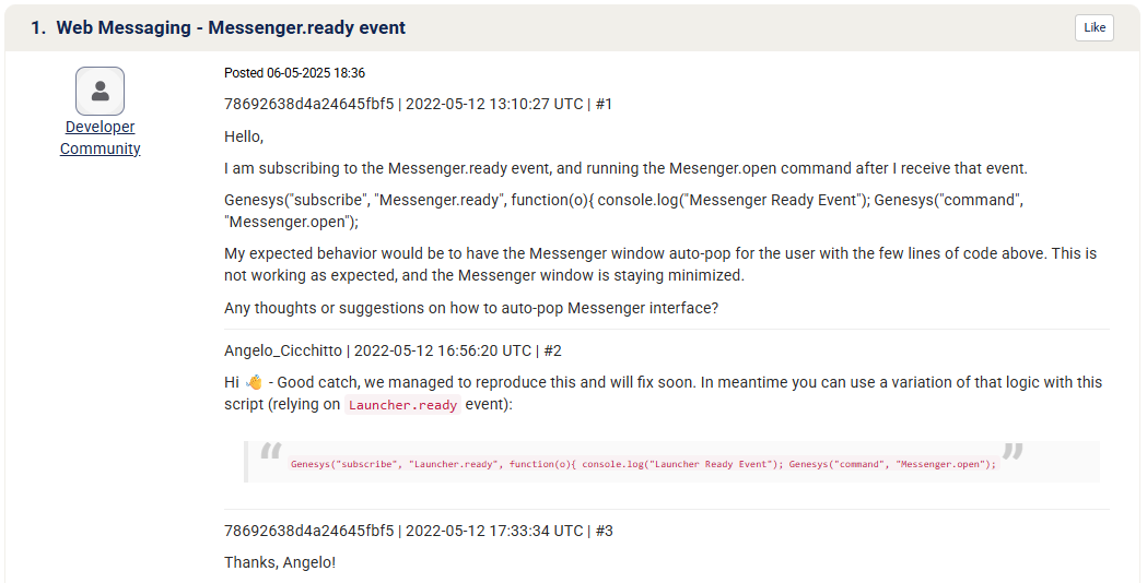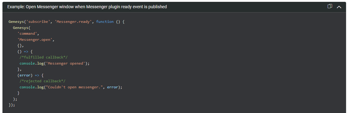 We also have an internal support web messenger (powered by a Virtual Agent) on our intranet. Within the script section of our html code, we added the code you referenced from the messenger plugin resource article. Since then, as soon as our support page loads, our web messenger widget automatically opens.