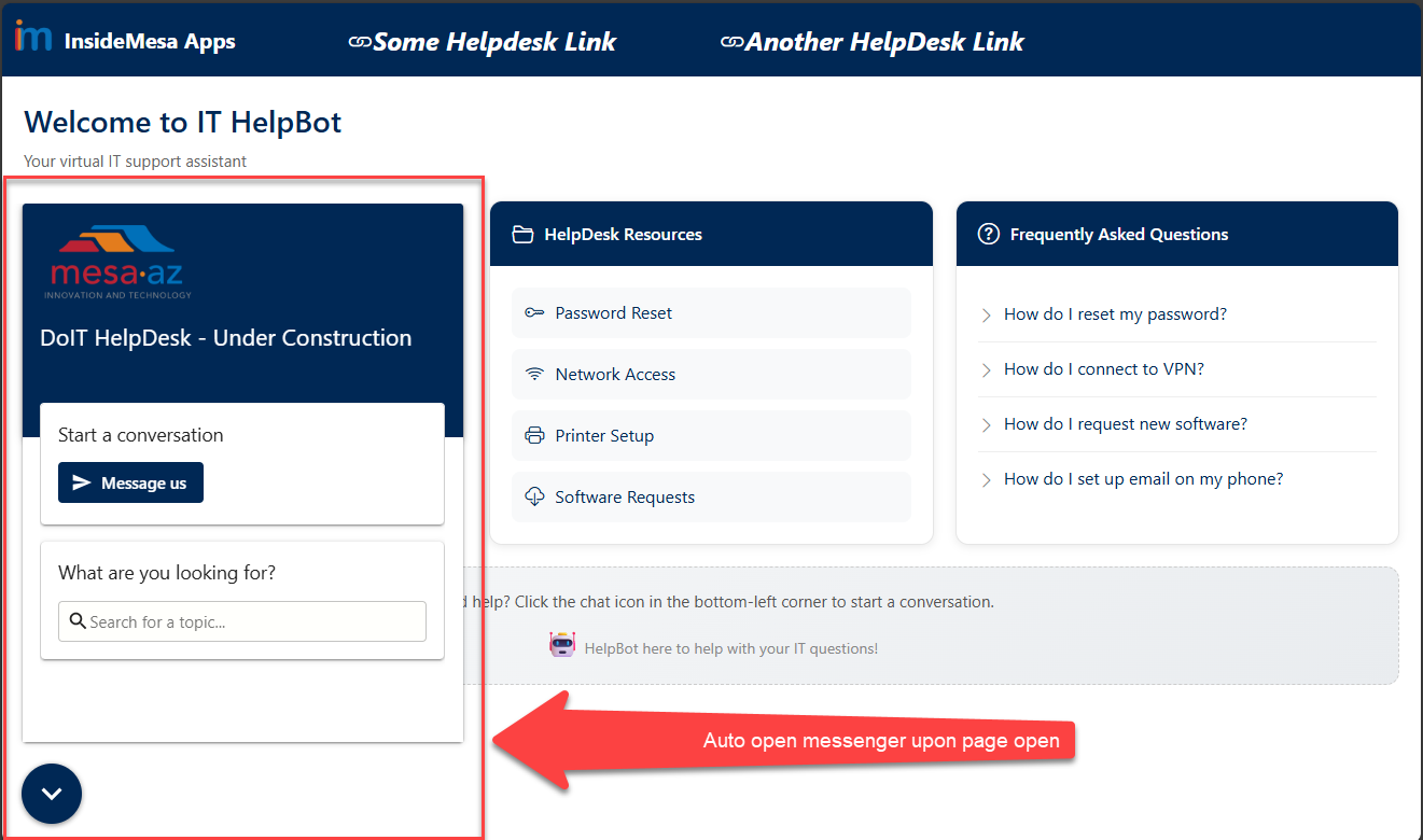 We are building a digital bot messenger on a helpdesk site that is linked from another site. We want the bot to auto open when the page is launched...How are others accomplishing this?