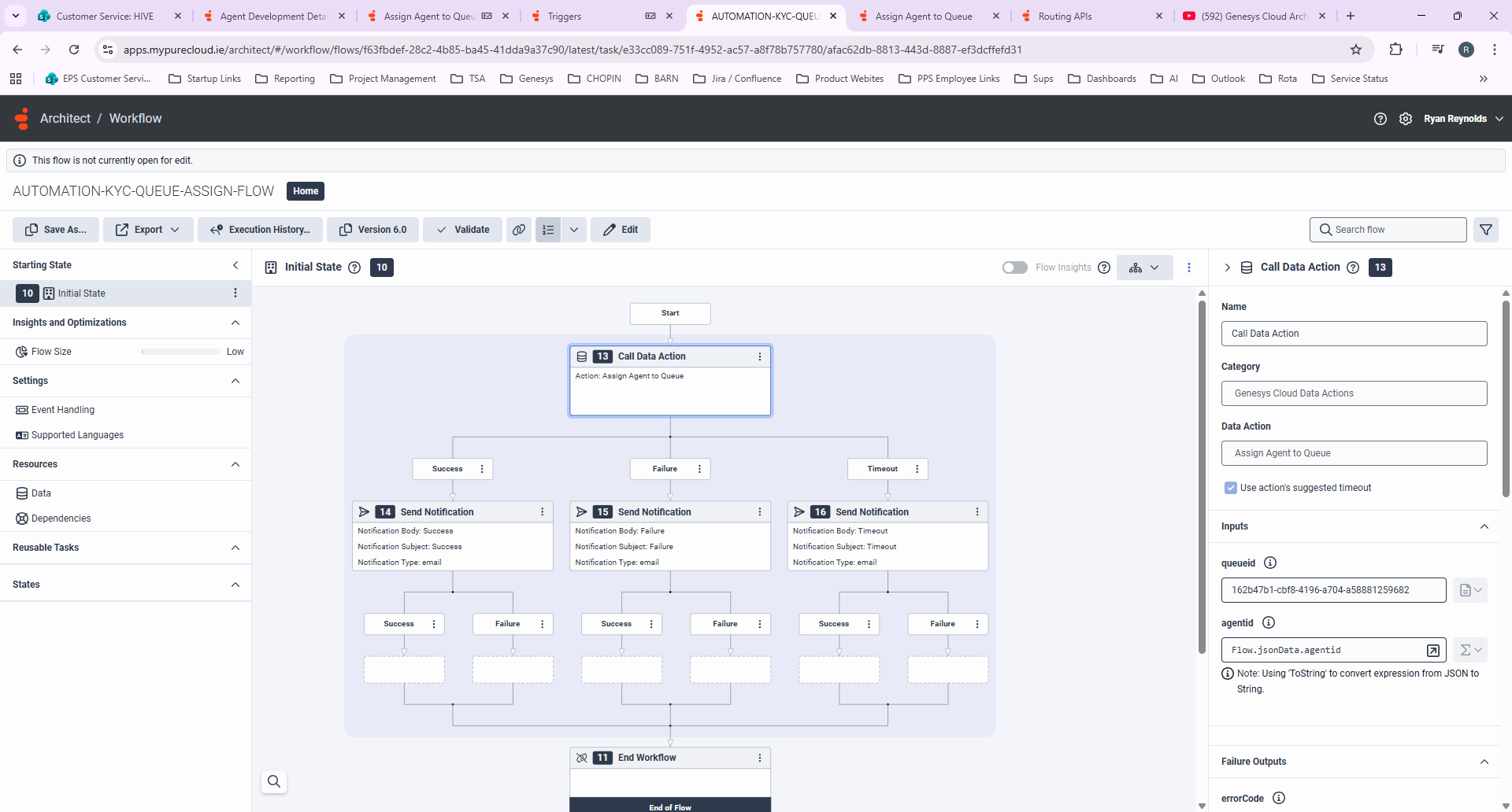 I even tried hardcoding both the agentid and queueid just to test if it works without a variable but that did not do anything either. No email is sent, so I'm assuming there's something wrong with how the workflow is configured.
