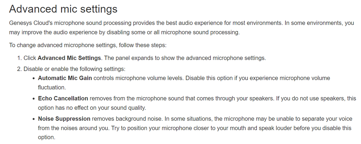 Hi Guys, we are having the same issue mostly with Plantronics headsets, for us the solution was disabling all Advanced mic settings, but the problem is when you refresh browser tab or Genesys app all Advanced mic settings become active again (return to default). Genesys care team stated that this is expected behaviour, I can't understand how this can benefit users except that it forced them to reconfigure these settings every time when they start Genesys, it has no common sense.