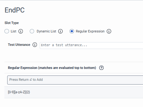 I've got a bot where we ask customers for the last 3 characters of their post code. In the UK, this will always be one numerical character, followed by two letters e.g. 1AB. I have a slot, where I am using a regular expression of [0-9][a-zA-Z]{2}