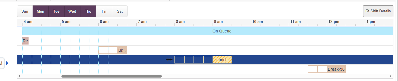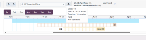 Here you can see the variable times available for each of the breaks/lunch, but what we are finding is that there doesn't appear to be a configurable setting for how much time there should be between each break. We have agents being generated with their 1st break in the last possible window, followed by a lunch in the first possible window, and their 2nd break in the last possible window - this is putting the first break and lunch 1.25 hrs apart, but then the next break not happening for 3.5 hours.