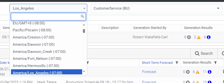 If you are talking about schedules, you can set the time zone next to the MU/BU selection: