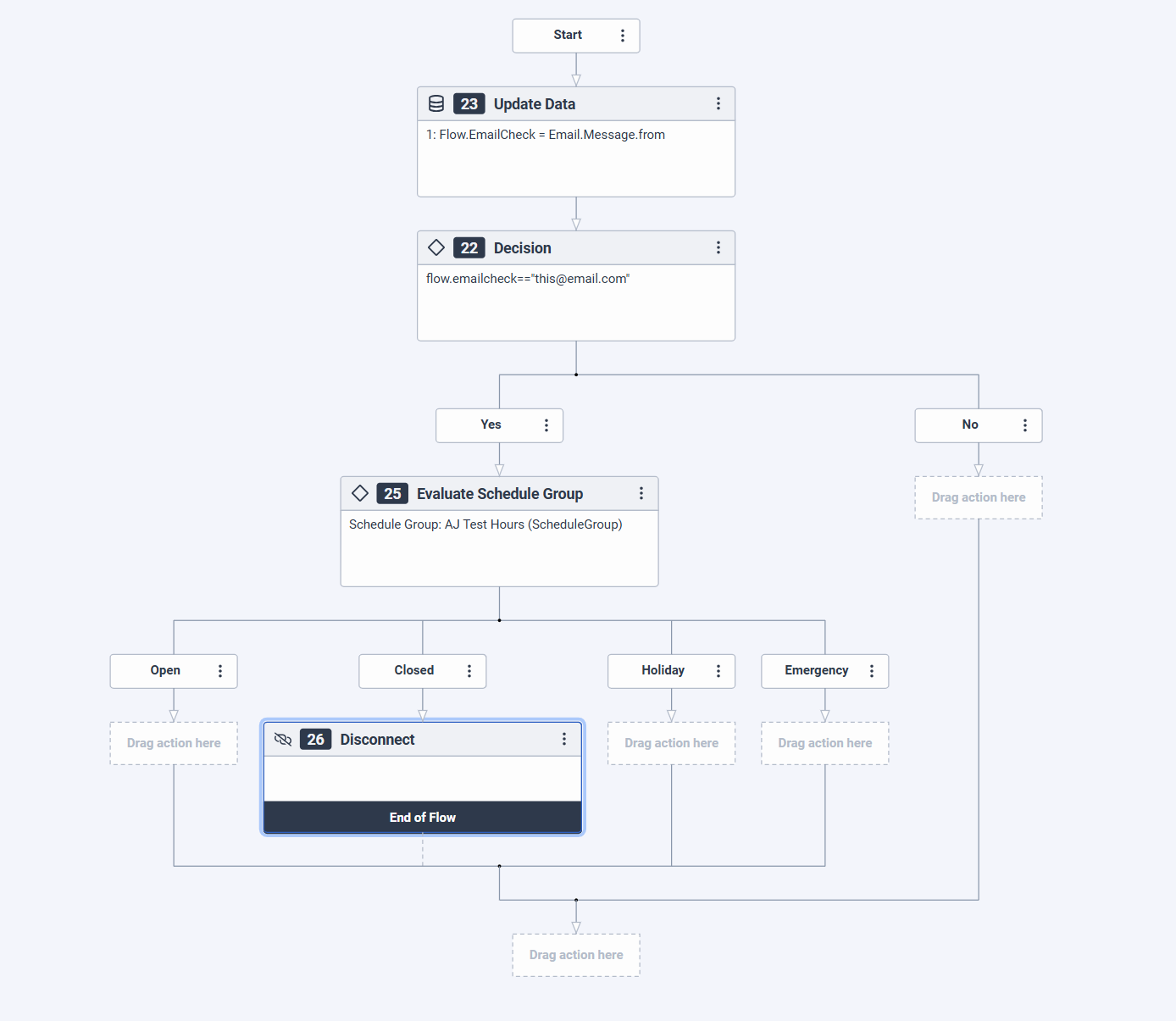 Based on Andy's question and the flow example you just posted, can you share why you're queuing the emails in Genesys at all if you're simply going to just disconnect them?