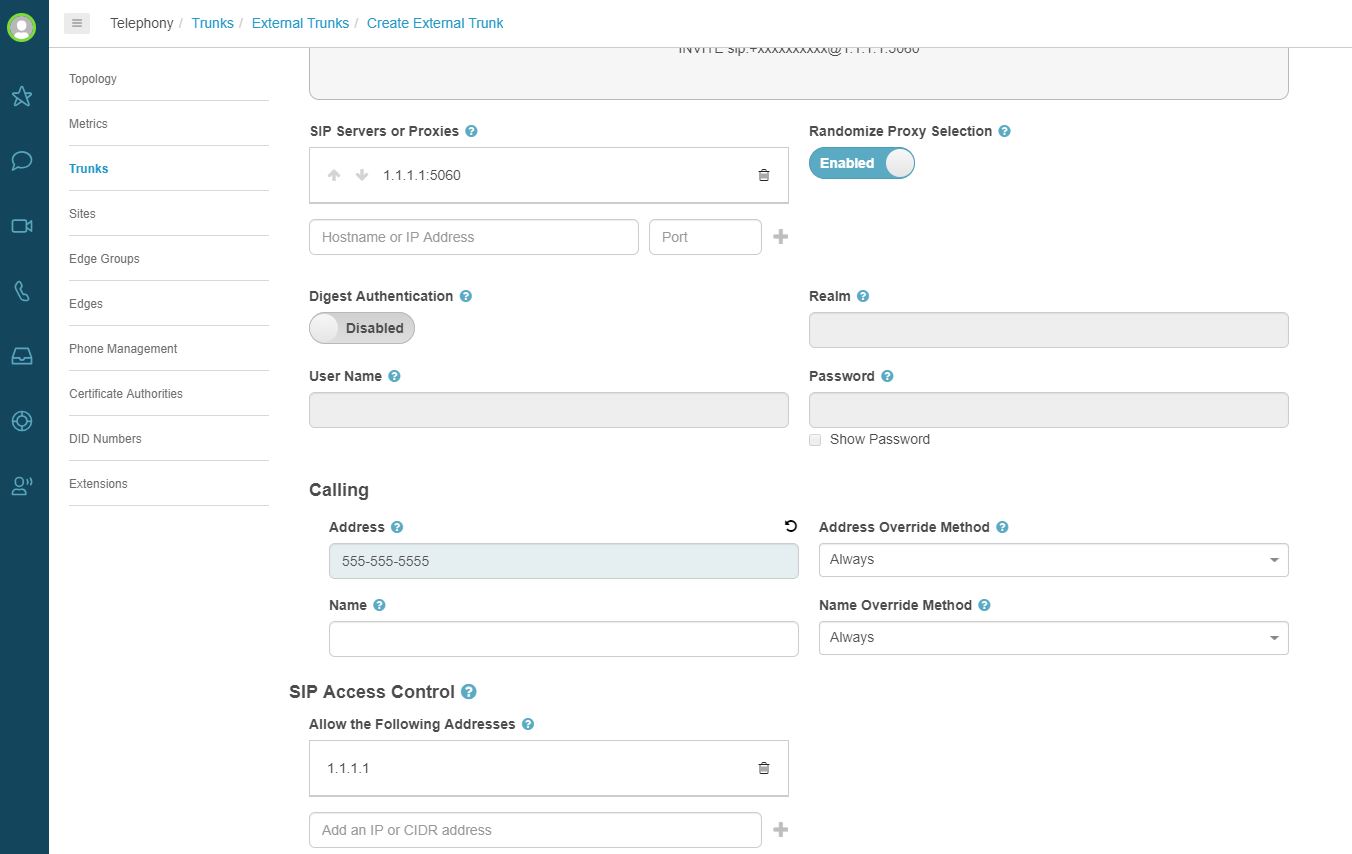 6. Next add a calling address under Calling and Address. Although AT&T IP Toll Free is inbound, a calling address is required by PureCloud. Also, make sure the SIP IP and port from step 5 show up in the SIP Access Control / Allow the Following Addresses box. If it doesn't, you will need to add the IP(s) and port(s).
