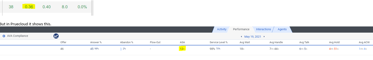 1. Can someone provide me with a calculation used to get the ASA in the Queues Performance view? I know the standard ASA definition is Total Time to Answer/Number Answered, but what API fields should I be using?