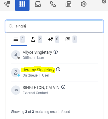 Got an odd issue. I have a Genesys user that when he tries to make a call to internal personal by name, no internal personal come up in the suggestion dialog box. I'll use Jeremey Singleton as an example: