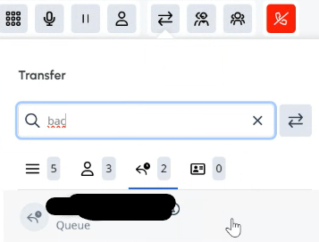 When agents search for a queue to transfer a call to, sometimes they don't select an option before clicking the Transfer button or hitting Enter. Once they click the Transfer button, the call drops. This particularly happens when they assume they've made a selection because only one option appears. Imagine if below instead of selecting the option, the agent typed "bac" and immediately hit Enter.