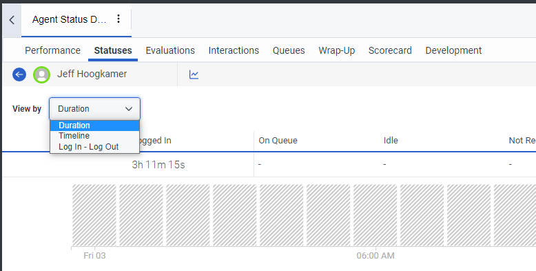 For example, in the Supervisor version of 'Agent Status' - the 'View by' option is visible to view by Duration, Timeline or Log In - Log Out.