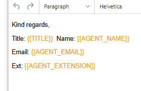 1.) {{AGENT_NAME}} works, and is auto-converted to the agent's name. However, {{AGENT_EMAIL}} and {{TITLE}} do not convert at all, even when using html exactly the same as {{AGENT_NAME}}.
