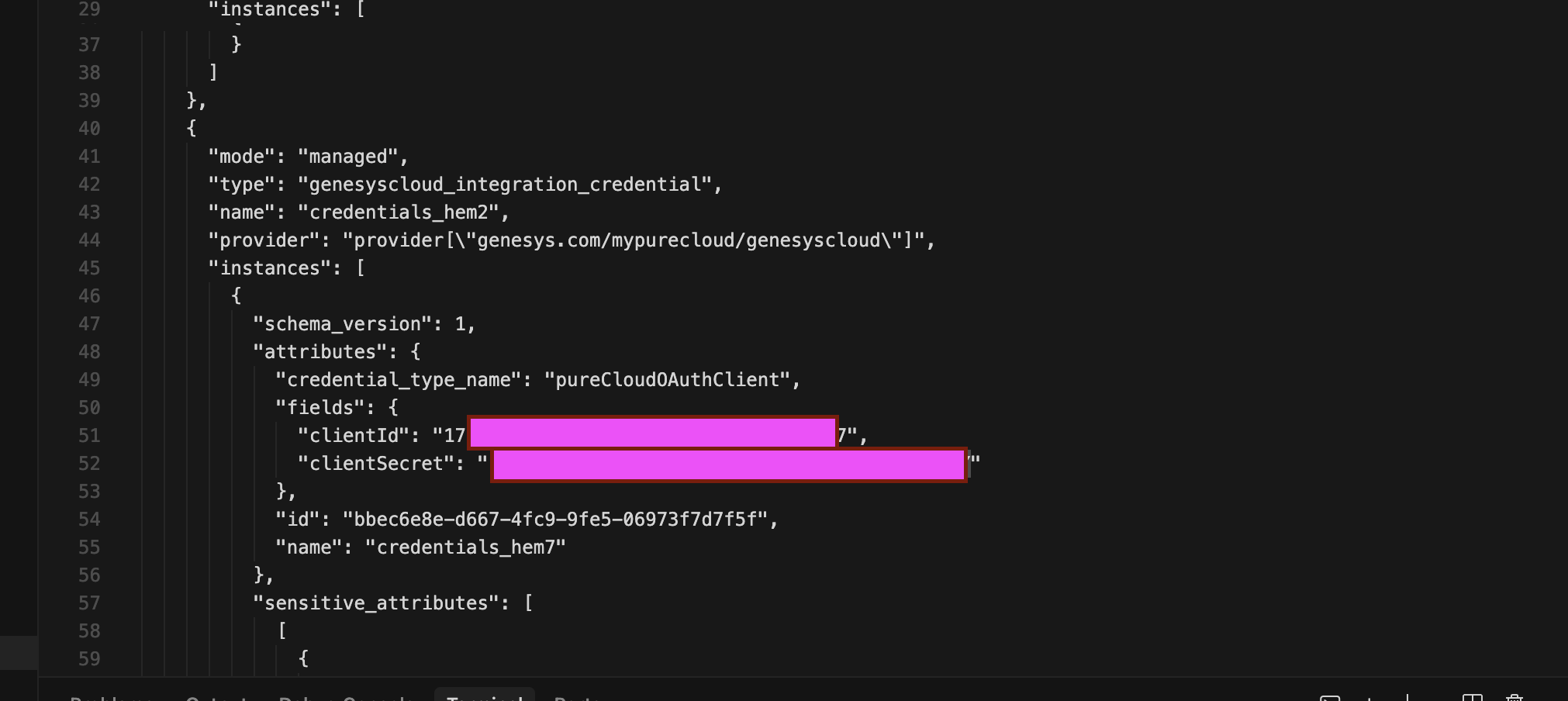 I am trying to save a clientId and clientsecret. Here is my tf code which seems to be set up right per Genesys' documentation but the value for the id and secret keep coming back null.